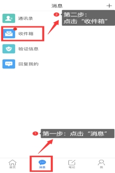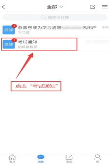 1.点击最下方“消息”🧑🏿🌾,消息栏中选择“收件箱”👨🏽🚒;查找所报考的对应学校发布“考试通知”🧑🧒🧒♠️,点击进入;