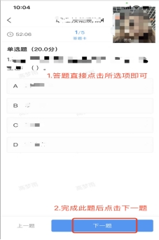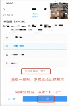 4.开始答题并交卷👩🏽🌾,每题选择正确答案点击该选项即可,点击右下角“下一题”继续作答;直到最后一题时系统会提示“已经是最后一题了”,可点击“下一步”进行答题情况核查🖍。