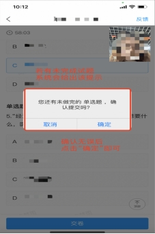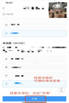 5.核查作答情况时,可修改选择答案;确认无误后,点击最上方的“交卷”按钮🦓,并确认提交👩❤️👨🗡。(若存在未作答题目🚵🏼♀️,系统会提示⚰️,请注意核查🟪!)