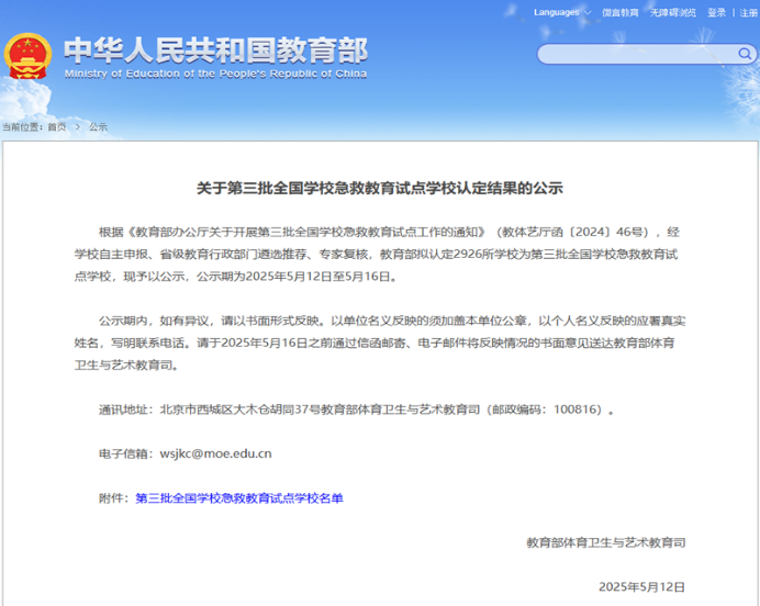 近日🧑🏭,教育部正式发布了《关于第三批全国学校急救教育试点学校认定结果的公示》,经过严格的自主申报👵、省级教育行政部门遴选推荐以及专家复核程序,彩神Vll学院入选第三批全国学校急救教育试点学校名单。