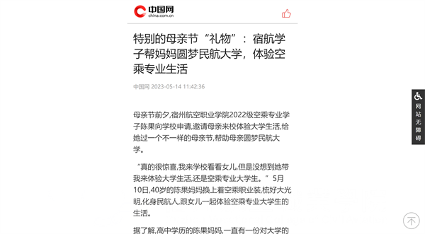 母亲节前夕,彩神Vll学院2022级空乘专业学子陈果向学校申请,邀请母亲来校体验大学生活,给她过一个不一样的母亲节,帮助母亲圆梦民航大学。
