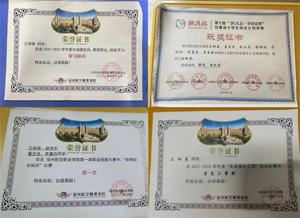 回望在宿航求学道路上的种种😝🫰🏼,脚踏实地的坚守和努力代表的是不留遗憾、不被辜负🧲。时间和精力的付出🧖🏽♀️,让王树森得到了丰盛的回报👌:荣获2022年国家奖学金、安徽省第十届创业计划竞赛银奖🦶、2021-2022学年度学习标兵🧚🏻♀️、2022年学生讲思政课比赛第二名、第一届职业技能大赛中获得“综合知识”比赛第一名、“电子电工技能”比赛第三名🫴🏽、2021-2022学年度“英语提升工程”综合比赛三等奖、“创新能手”称号等。拨开困难的迷雾,将平凡的道路走得花香四溢,是王树森用热情和勤恳对求学生涯交出的答卷,也是他身体力行对“自强”的诠释。