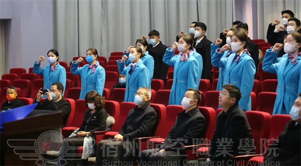 宿航院校学子全体肃立,注视国旗高唱国歌。