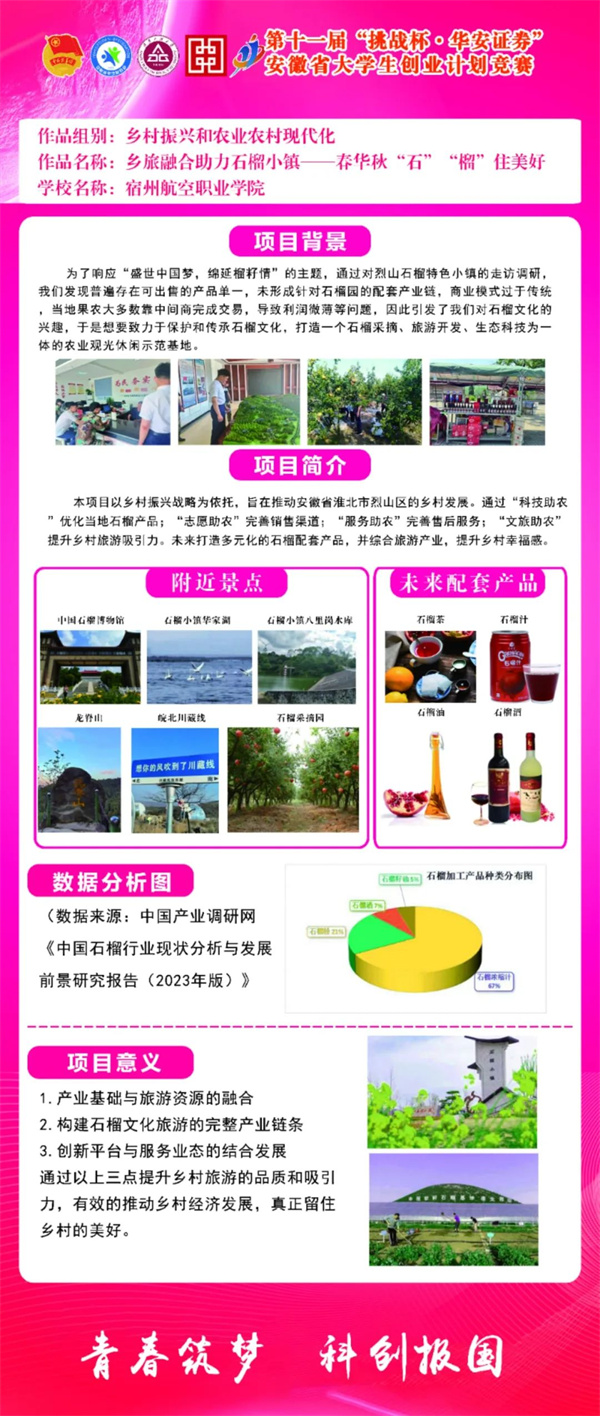 参赛项目涉及科技创新和未来产业、乡村振兴和农业农村现代化、生态文明建设和绿色低碳发展🖋、文化创意和区域交流合作、社会治理和公共服务五个类别🐣。其中《乡旅融合助力石榴小镇——春华秋“石”“榴”住美好》项目成功入围省级决赛💐。