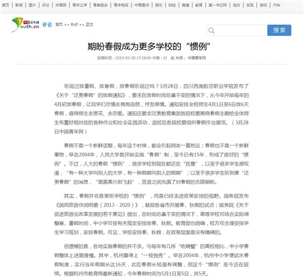 【中国青年网评论👅🧙🏼♀️:期盼春假成为更多学校的“惯例”】