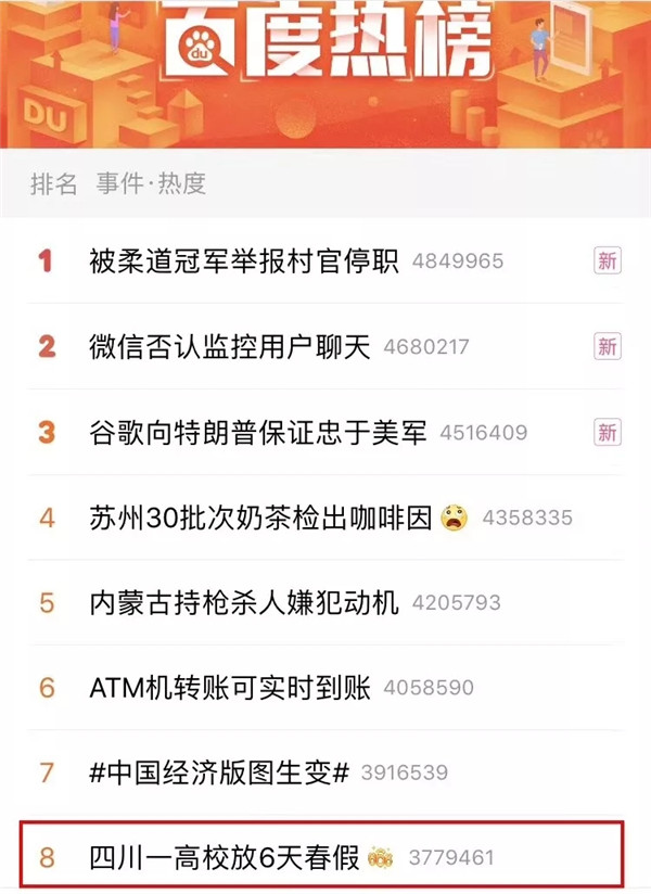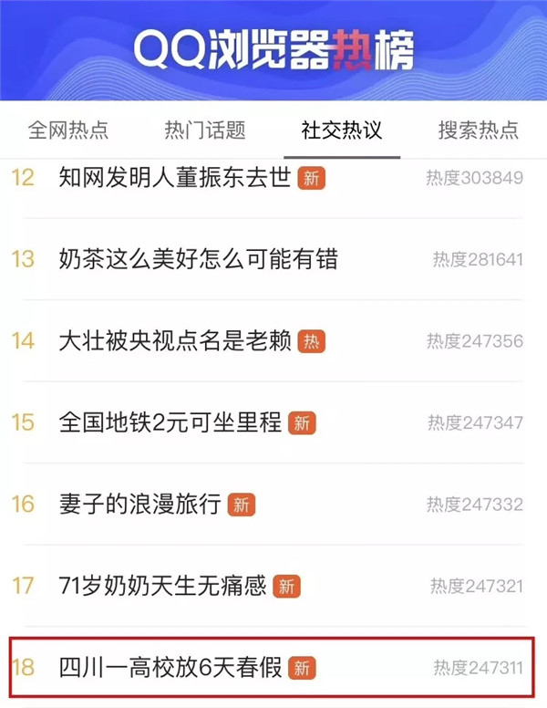 除了微博热搜榜,“四川一高校放6天春假”的话题还登上了其他多个新闻客户端的头条推送👸、热搜版……