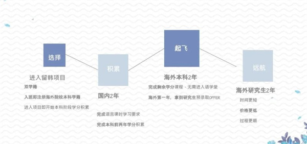 第三年:海外”2+2“本硕直通车进入韩国高校开始本科大三阶段学习,发放海外名校”研究生预录取通知书“完成本科学分课程毕业后,直接进入韩国名校大学院(研究生院)学习🧦。