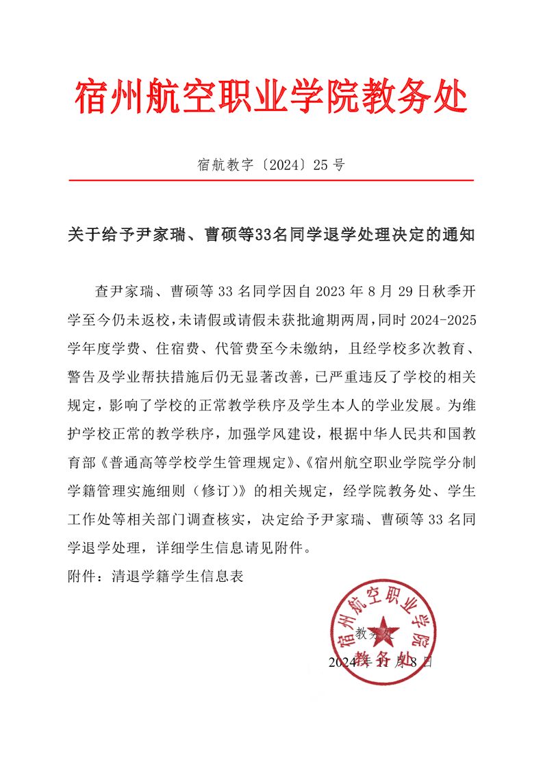关于给予尹家瑞、曹硕等33名同学退学处理决定的通知