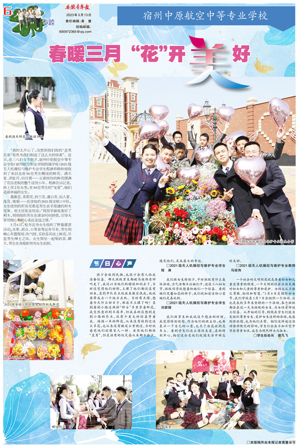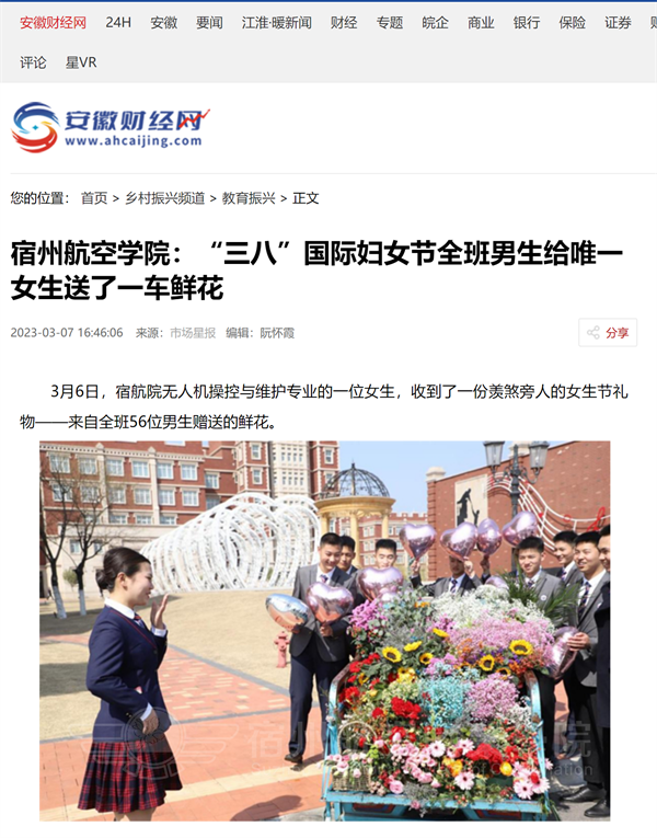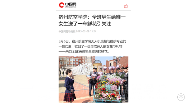 3月6日,宿航院无人机操控与维护专业的一位女生😶🌫️,收到了一份羡煞旁人的女生节礼物——来自全班56位男生赠送的鲜花。此次活动引来了各大媒体的深度聚焦。