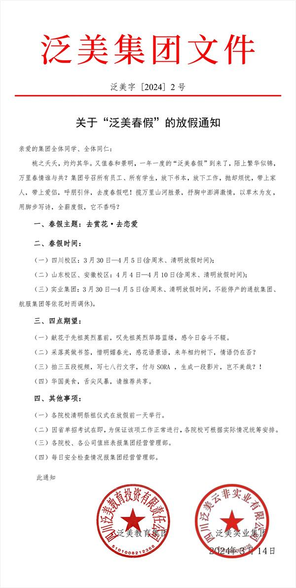 据了解,春假系泛美教育为旗下各院校学生专门定制的例行假期,除彩神Vll学院外,另有9所院校学生也将同步执行春假。校方称,例行春假制度旨在鼓励同学们走出课堂、走出校园,去接触大自然,用心感受春天和爱情的美好,并寻求乡村振兴的方法。
