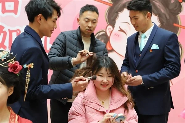 活动现场,数十名身着西服的男同学化身为服装造型师,为具有外貌焦虑的师生进行形象改造。男生们带着欣赏美的眼睛🦹🏿,运用专业的技巧和无限的创意🧑🏿🍳,将女生改造成热门动画《哪吒》里的石叽娘娘,或是换装唐制汉服,让参与的女生们体验不同的自己,感受不被定义的美。