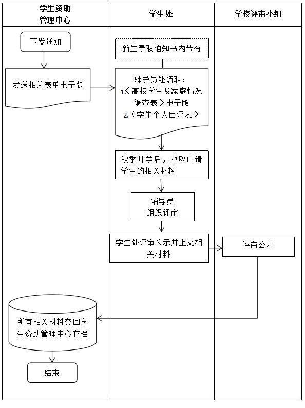 | 2.领取相关表单 | 新生录取通知书内带有;老生在学年度结束前找辅导员领取。学生持《高校学生及家庭情况调查表》到户籍所在地的相关部门去签字盖章。 | 学生处 | 1.《高校学生及家庭情况调查表》 2.《学生个人自评表》 |