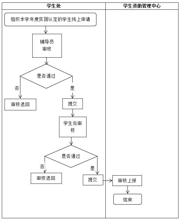 | 2.1 | 辅导员登录自己的账号对班上被认定的贫困生进行审核,审核完成后提交审核数据。 | 学生处 |
