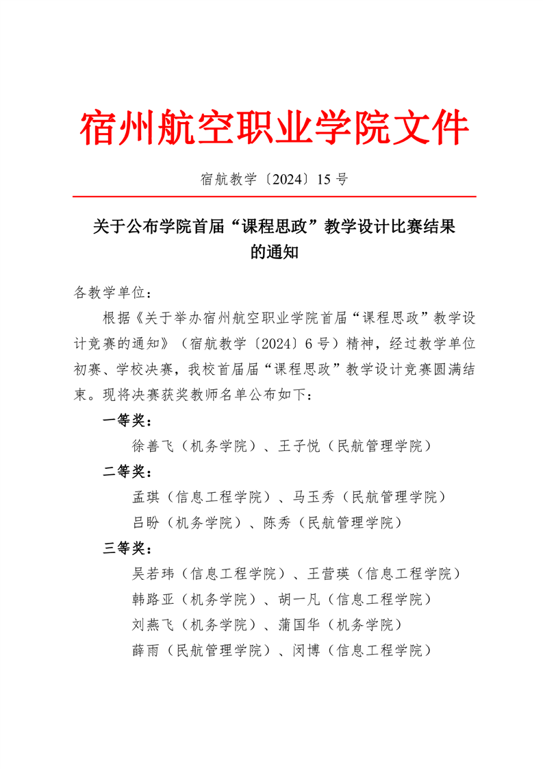 关于公布学院首届“课程思政”教学设计比赛结果的通知