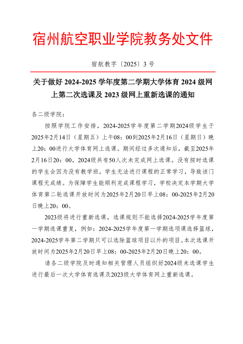 关于做好2024-2025学年度第二学期大学体育2024级网上第二次选课及2023级网上重新选课的通知
