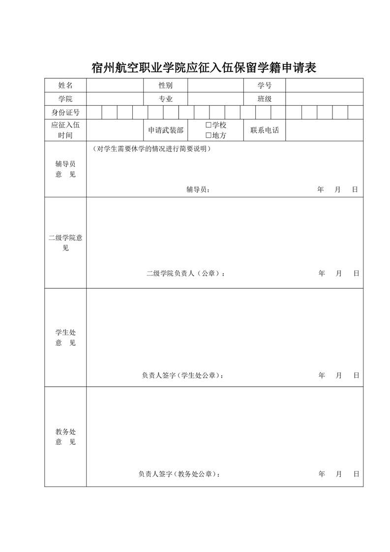 彩神Vll学院 应征入伍保留学籍申请表