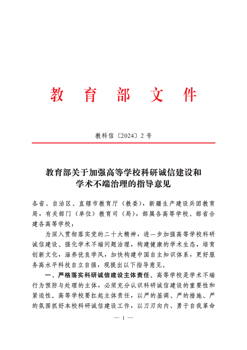 教育部关于加强高等学校科研诚信建设和学术不端治理的指导意见