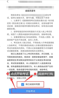2.点击考试按钮,阅读并同意考生承诺后进行打钩,点击“开始考试”;