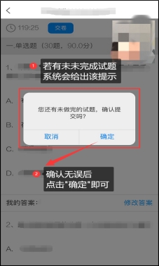 5.核查作答情况时𓀒,可修改选择答案;确认无误后☸️,点击最上方的“交卷”按钮👈,并确认提交🤹🏻。(若存在未作答题目👮🏻♂️,系统会提示,请注意核查!)