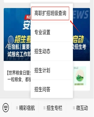2.进入公众号后,点击“招生专栏”🏇,点击上方“高职扩招班级查询”🦉;