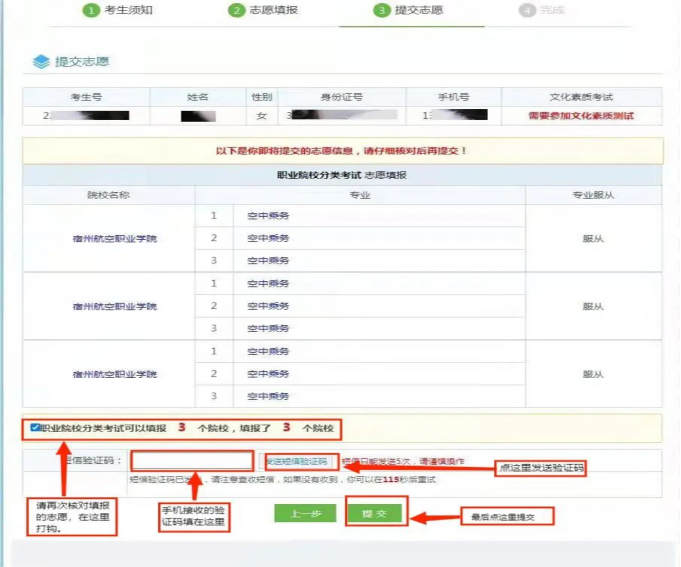 8.请再次核对填报的志愿,填写手机接收的“短信验证码”后𓀕🫛,点击“提交”。
