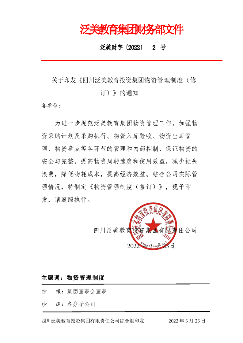 关于印发《四川泛美教育投资集团物资管理制度(修订)》的通知