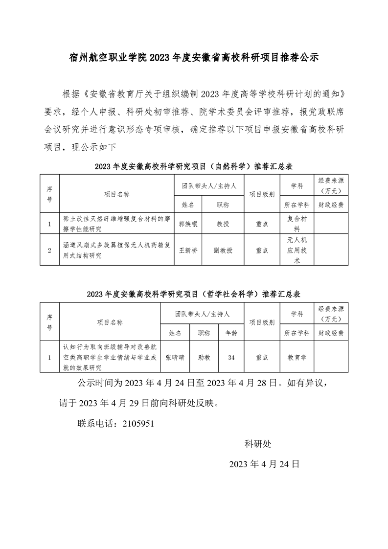 彩神Vll学院2023年度安徽省高校科研项目推荐公示