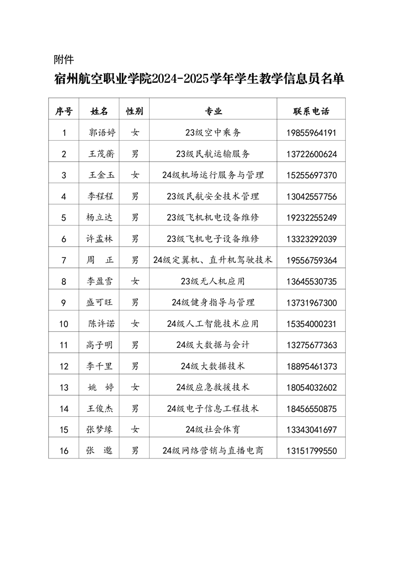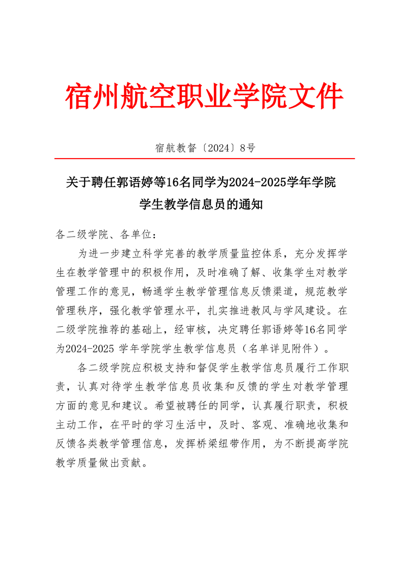 关于聘任郭雨婷等16名同学为2024-2025学年学院学生教学信息员的通知