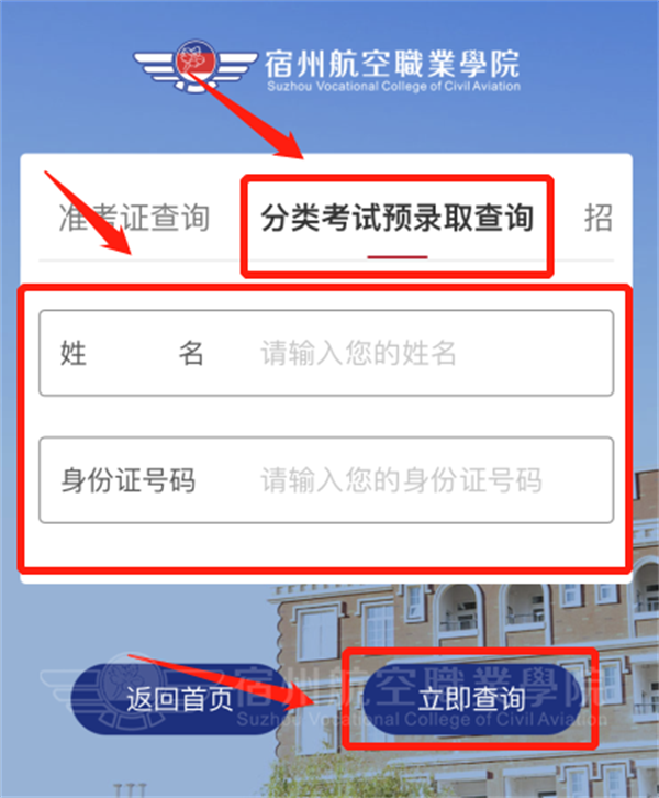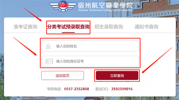 2.进入后点击“分类考试预录取查询”🧑🏼🦰,根据提示填写学生姓名及身份证号码🎿,填写正确后,点击下方“立即查询”🧏🏻♀️;