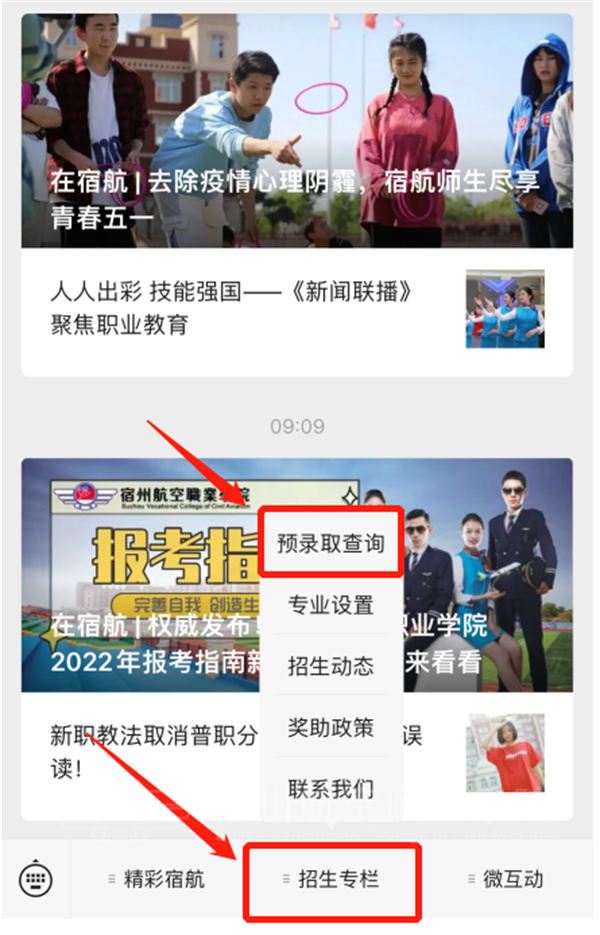 2.进入公众号后点击下方“招生专栏”👩🦳🧑🏼🌾,之后点击上方“预录取查询”🤾♂️,进入查询页面🙎♀️;
