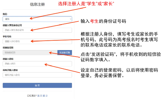 考生或家长注册登录时会使用考生高考报名时填报的信息和电话号码进行身份验证。