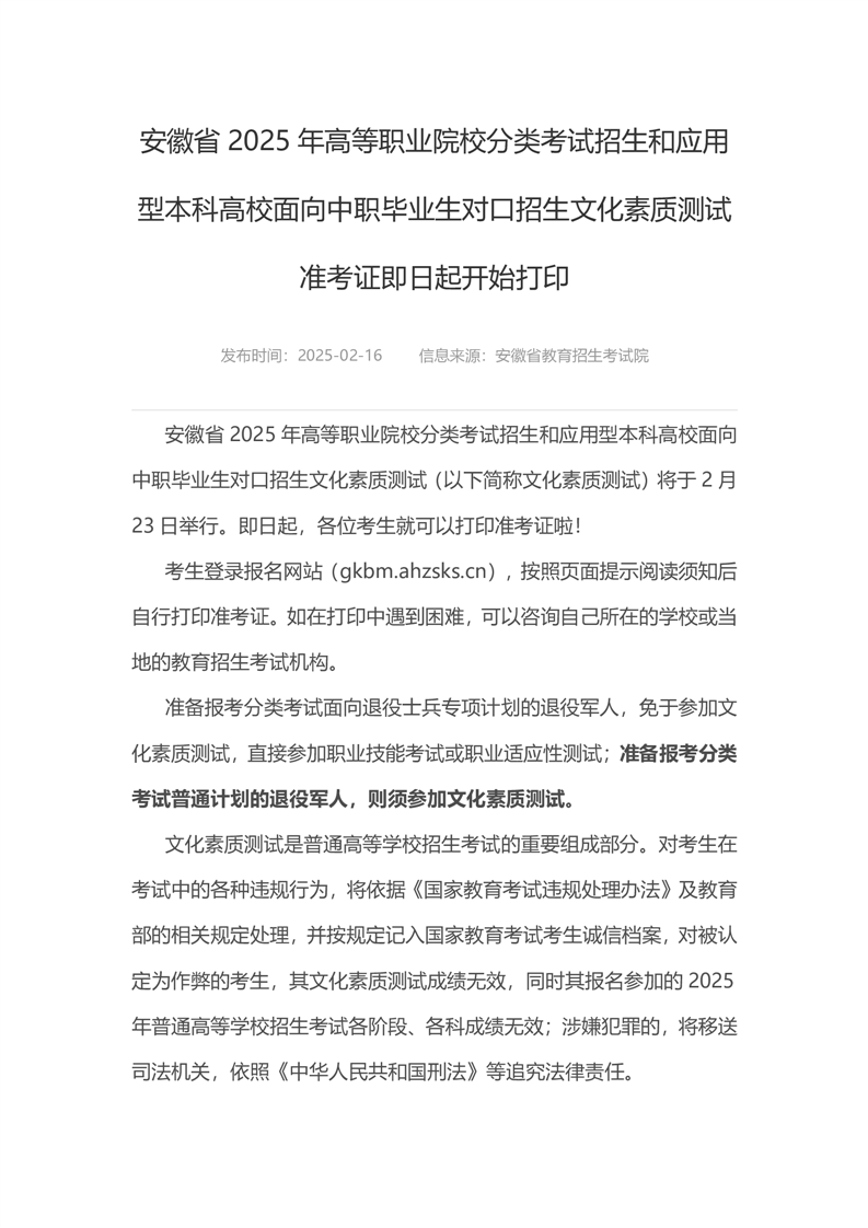 安徽省2025年高等职业院校分类考试招生和应用型本科高校面向中职毕业生对口招生文化素质测试准考证即日起开始打印