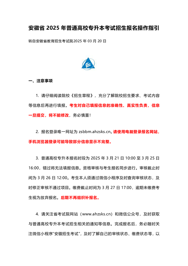 安徽省2025年普通高校专升本考试招生报名操作指引
