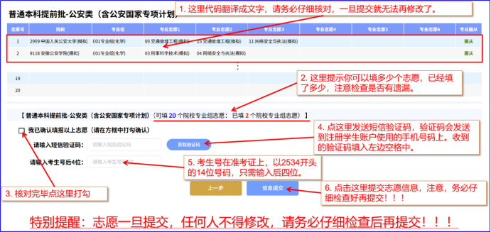 1.志愿提交之前👩‍🚒🤾🏽‍♀️,可以进行志愿信息调整修改🪢,务必仔细检查👋🏽,注意看清页面提示信息🙇🏼‍♀️,确认志愿信息修改完毕,确认无误不再修改后再提交🐦‍🔥。志愿一旦提交,任何人不得修改🫄🏽💂🏿。