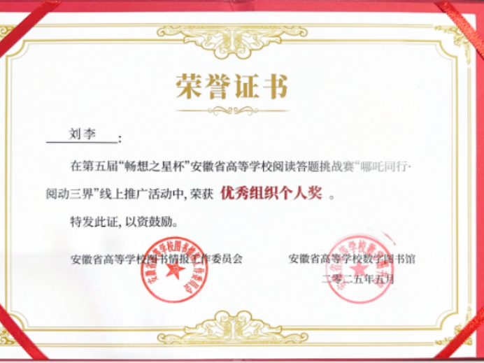 2025年3—6月,由安徽省高校图工委联合畅想之星平台共同主办,以“哪吒同行·阅动三界—阅读积分挑战赛”为主题的答题挑战赛落下帷幕。本次大赛旨在推动高校师生深入利用数字资源,培养终身阅读习惯。活动涵盖在线打卡🧾、阅读积分等多元形式✮👨🏼🔬,共计吸引了安徽省83家图书馆、5794名师生参与。我校图书馆凭借出色的组织工作和师生的积极参与🧙🏼,荣获“阅读推广优秀组织单位”🧑🏼🍳👰🏿♀️;刘李老师表现优异获得“优秀组织个人奖”。