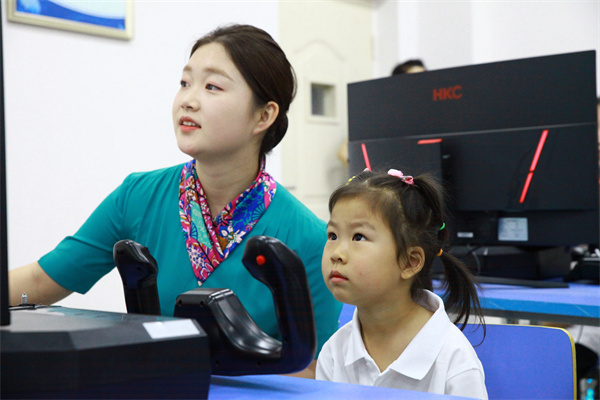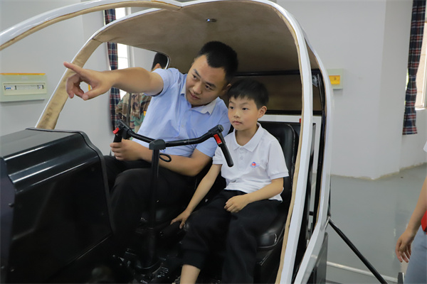 小朋友们轮流进入飞行模拟器体验
