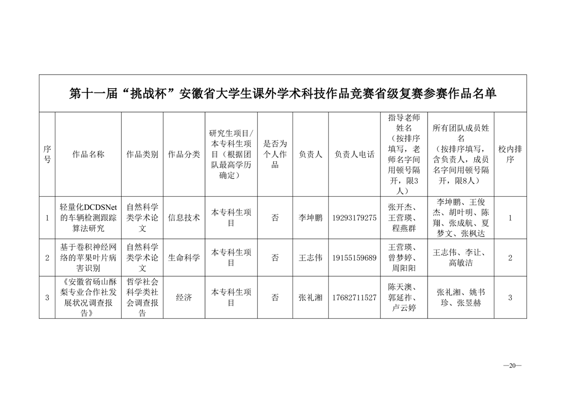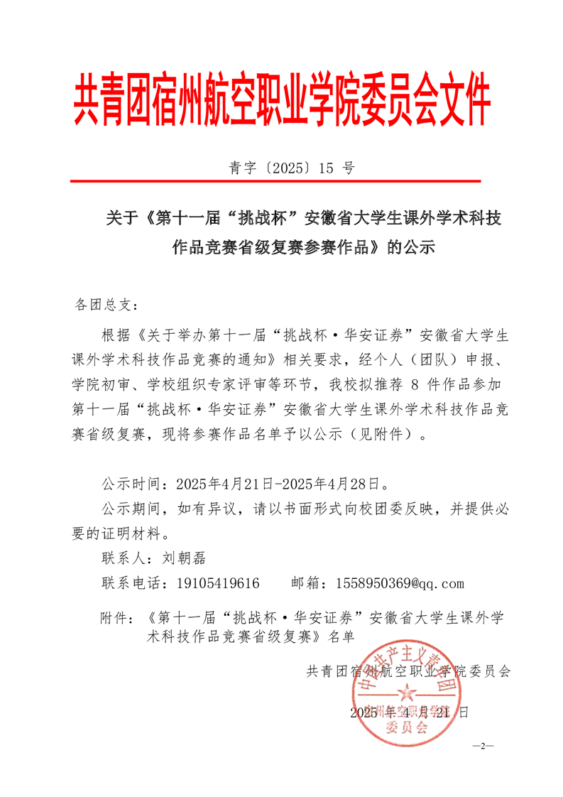 青字〔2025〕15 号关于第十一届“挑战杯”安徽省大学生课外学术科技作品竞赛省级复赛参赛作品的公示