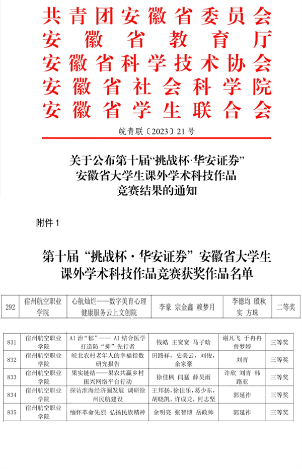 202369日至11日,由团省委🐘、省教育厅🧷、省科协、省社科院、省学联共同举办的第十届“挑战杯·华安证券”安徽省大学生课外学术科技作品竞赛决赛,在安徽理工大学举行。我院学子再创佳绩,终审结果已揭晓,我院推荐6件作品分别斩获省二等奖一项♛,省三等奖五项👨🏼‍🌾。