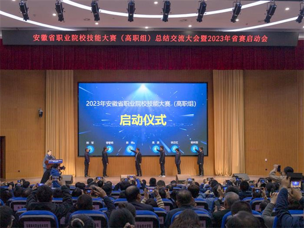 大会现场,各位领导共同按下按钮𓀚,标志着“2023年安徽省职业院校技能大赛(高职组)”正式启动🚴🏼♂️。