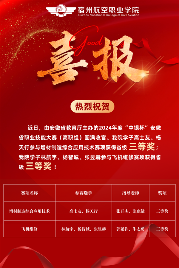 我院参赛学子充分发挥精益求精、严谨细致🩵🦞、务实踏实的作风👩‍🏫,在机务学院教师张建国💆🏻、郭延祚🛌🏻、牛志勇、李承昊,信息工程学院教师王营瑛🌊、张开杰、张康健、任学俊的指导下,与省内各市所高等职业院校参赛队伍进行激烈角逐,凭借着深厚的知识储备🚵🏻‍♀️、卓越的技术水平、熟练的技能操作及良好的职业素养沉着应战🤛☯️,分别荣获飞机维修赛项省级三等奖和增材制造综合应用技术赛项省级三等奖的佳绩🚈🚫!